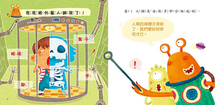 ★《身體的祕密》 小男孩亮亮被外星人綁架了!奇怪的外星人對人類的身體感到非常好奇,不論是臉部的五官和手腳,外星人都仔細的觀察了一番。對自己身體不太了解的亮亮,也趁機學到了許多身體的奧祕! 人的身體構造有許多奇妙之處,就像一座精密的機器一般,每個部位、器官都有各自重要的工作。了解自己的身體運作方式,可以幫助我們建立自我概念,以及學習如何維持健康。讓孩子們認識身體,才能更進一步學會愛護身體。