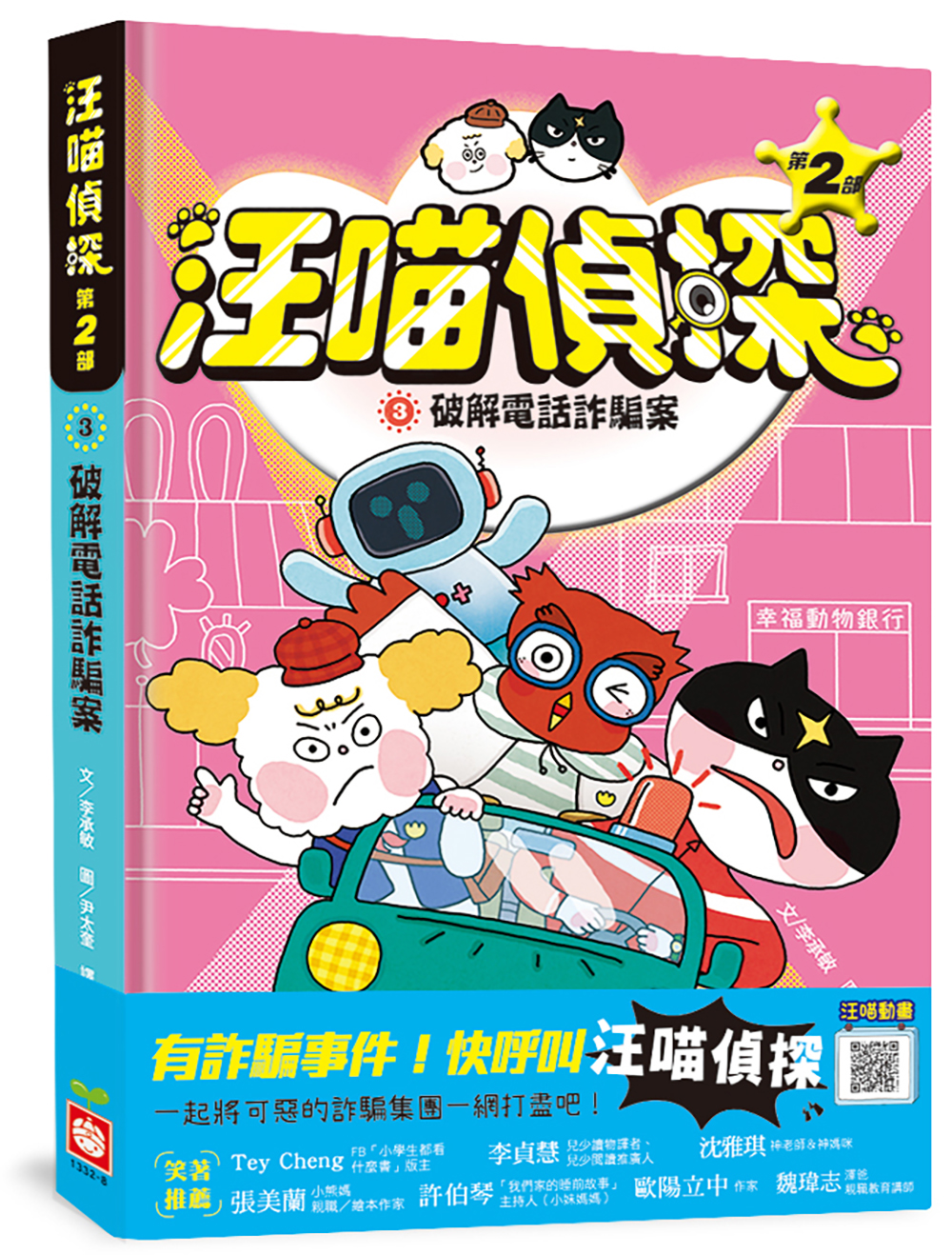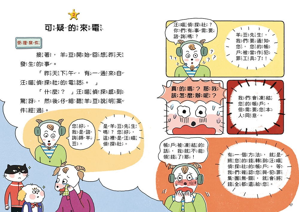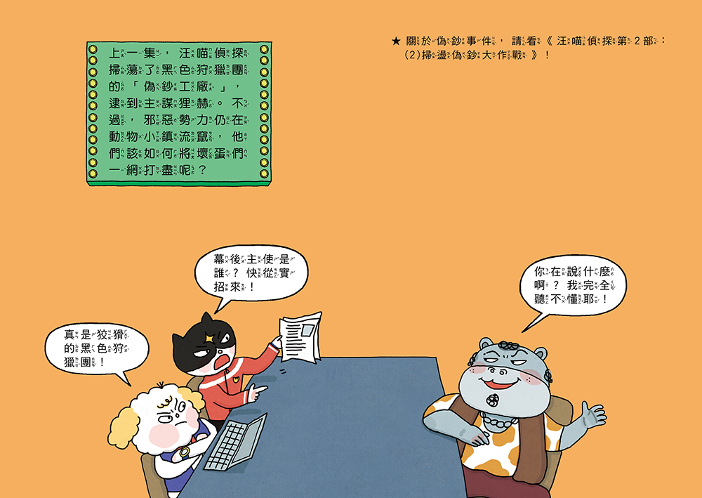 原來,詐騙集團與壞蛋組織「黑色狩獵團」有關,而這一切的幕後黑手,就是壞蛋們口中的「老大」。汪喵偵探決定將計就計,利用咕咕研究員發明的道具,讓集團的成員們受騙上當,以為要去參加員工旅遊,結果……竟然也落入「詐騙」陷阱啦! 汪喵偵探是否能順利抓住所有詐騙集團成員,將壞蛋們一網打盡呢?現在就翻開書本,努力找出所有線索,跟著汪喵偵探一起破解案件,解除動物小鎮居民的詐騙危機!