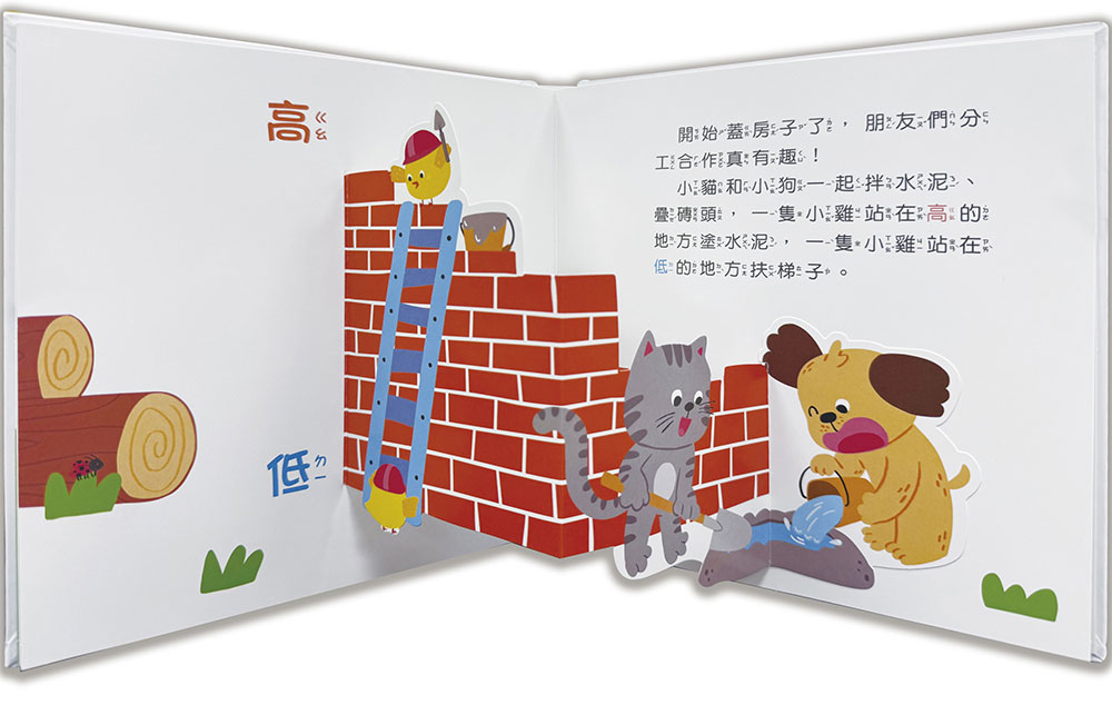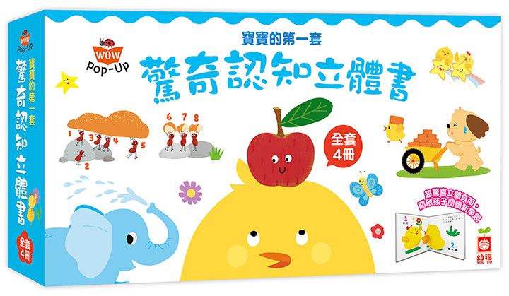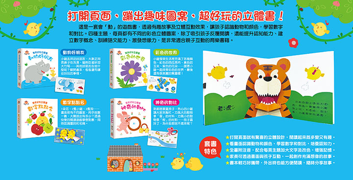 ■商品簡介 打開頁面,蹦出對比圖案,看看哪裡不相同! 這是一套會「動」的遊戲書,共有《動物好朋友》、《數字點點名》、《彩色的世界》、《神奇的對比》四個主題,每頁都有不同的彩色立體圖案,透過有趣故事及立體互動效果,讓孩子認識動物和顏色,學習數字和對比。 以幼兒喜愛及適合的內容來設計故事及畫面,讓孩子跟著主角小雞一起探索世界,邊閱讀邊遊戲,自然而然增加常識及習慣動腦思考與記憶,不論看幾次都有趣。除了吸引孩子反覆閱讀,還可提升認知能力、建立數字概念、訓練語文能力、激發想像力,是非常適合親子互動的育樂書籍。 此外,這套書還有一個好玩的地方──每個跨頁都藏著一隻「小瓢蟲」,快點發揮觀察力把牠找出來,還要說說看牠躲在哪裡? ■內容簡介 《數字點點名》 《彩色的世界》 《神奇的對比》