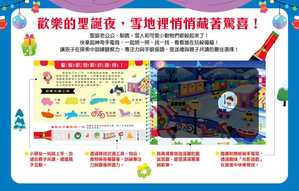■商品簡介 照一照、找一找~Bling Bling閃閃亮亮手電筒遊戲書! 快拿起神奇紙板手電筒,照一照閃亮的聖誕場景吧!哇!藏在黑暗中的驚喜圖案就會出現了!在尋找與發現的遊戲過程中,不僅能訓練專注力與觀察力,更能感受滿滿的節慶氛圍與溫馨氣氛,開啟最歡樂、難忘的親子共讀時光。 【內容物】 ◎本產品為紙製遊戲書,請避免拉扯或接觸水氣。