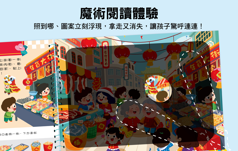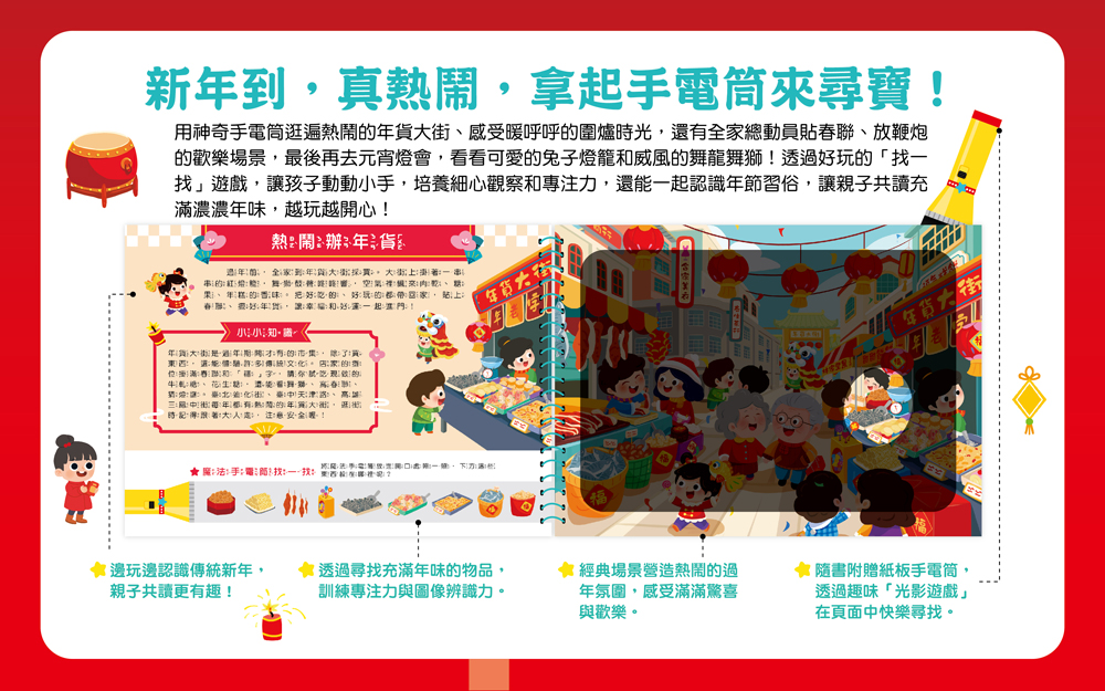 | ■商品簡介 一起熱鬧過新年 拿起手電筒,準備一起探索熱鬧的新年街景吧!結合光影找一找的互動玩法,只要用隨書附贈的紙板手電筒照一照,原本看不見的圖案立刻浮現,移開後又會消失,給孩子帶來驚呼連連的閱讀驚喜。書中以熱鬧的新年場景為主題,融入年節習俗、街市風景與生活認知,在遊戲中培養觀察力、專注力與閱讀興趣,是適合親子共讀的互動遊戲書。 【內容物】 ◎本產品為紙製遊戲書,請避免拉扯或接觸水氣。