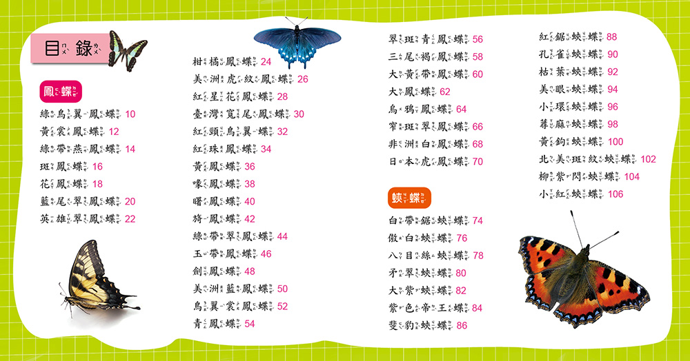 我們生活的世界存在著千千萬萬種昆蟲,而蝴蝶的種類更是多到目不暇給,如果學會辨認各種蝴蝶,是不是很有趣呢?你對蝴蝶的了解有多少呢?你知道蝴蝶雖然乍看都很像,其實牠們各有不同的斑紋和習性嗎?透過書中清晰又鮮豔的圖片、淺顯易懂的文字說明,探索各式各樣蝴蝶相關知識,並學習如何辨認牠們吧!