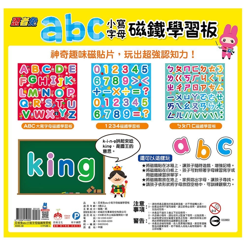| ■商品簡介 孩子在學習基礎認知時,最重要的就是好玩、多聽、多看、多唸。本產品設計26個英文小寫字母磁鐵,讓孩子在反覆遊戲的過程中,自然而然記住字母,並逐漸累積,除了學習板上的英文單字外,家長可再幫助孩子延伸學習更多的詞彙,培養英文語感。此外,還可搭配《忍者兔ABC大寫字母磁鐵學習板》一起遊戲,同時認識相同字母的大寫與小寫,熟悉之後,便能輕鬆運用,有助於單字的認讀。 在必須重複使用學習教材的情形下,磁鐵會是家長準備給孩子的良好教具。因為磁鐵輕巧,方便攜帶且耐用不易損壞,到任何地方都可拿出來玩,如此一來,孩子就可隨時邊遊戲邊學習,認知能力自然會提升