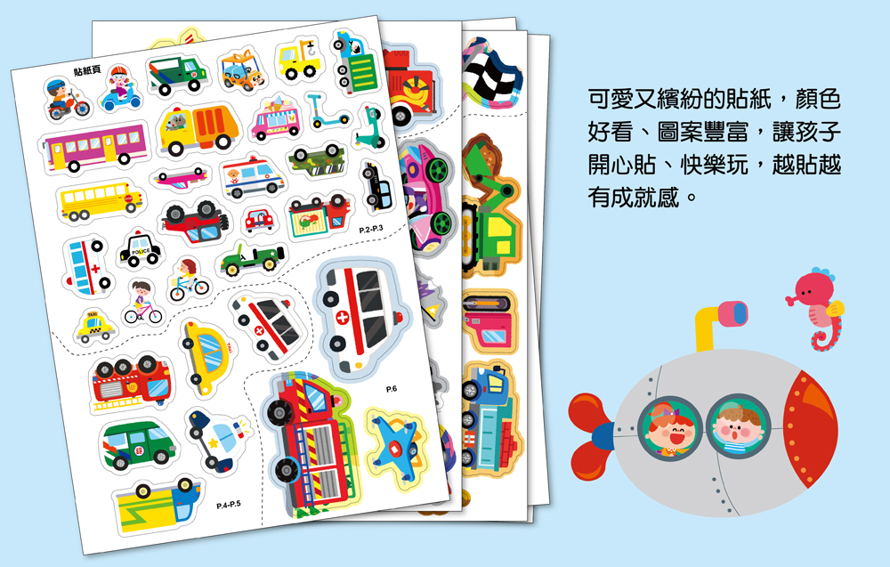 | ■商品簡介 海陸空總動員,玩出孩子最強大腦 以孩子熟悉又充滿吸引力的交通工具主題為核心,結合色彩鮮明的插圖與大量互動貼紙,從道路、城市、海上到天空,一步步認識各種交通工具的外型、用途與行駛場景。孩子先觀察畫面線索→思考交通工具的功能與位置→動手貼出正確選擇,培養專注力、邏輯思考。 ◎商品圖片可能因拍攝光線或螢幕顯示設定不同,顏色請以實際商品為準。