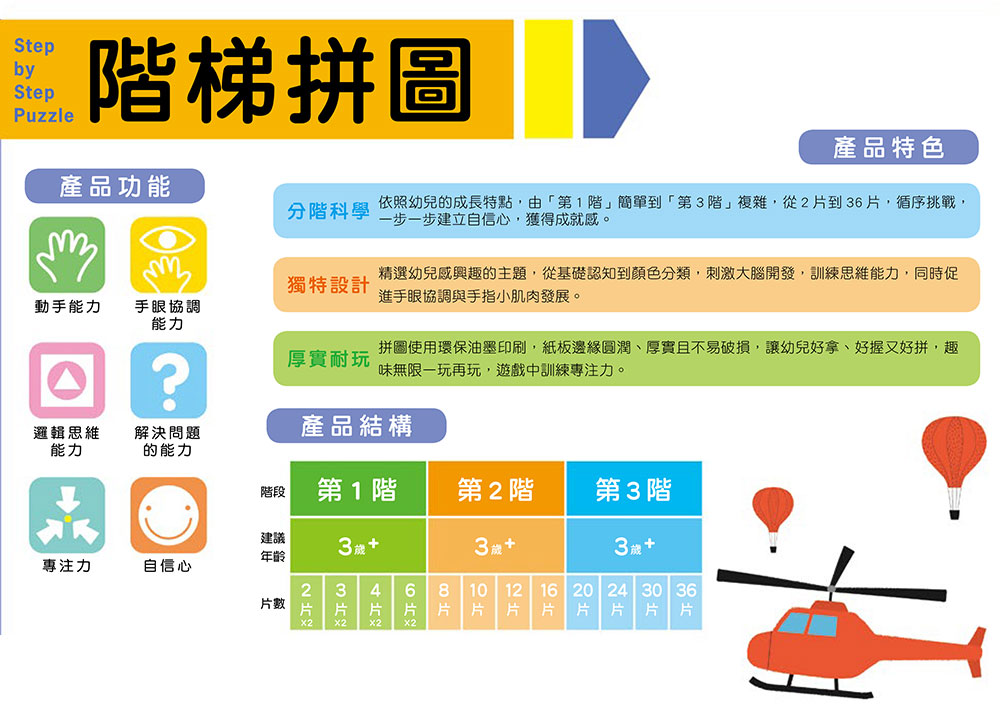 | ■商品簡介 分階科學:依照幼兒的成長特點,由「第1階」簡單到「第3階」複雜,從2片到36片,循序挑戰,一步一步建立自信心,獲得成就感。 內含4張拼圖:20片/24片/30片/36片