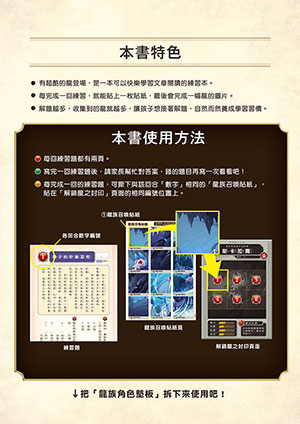 這是專門為孩子設計,兼具學習與遊戲功能的數學練習本,不僅內容扎實,視覺上也非常吸引人,而書中的各種神祕龍族角色,讓孩子在學習同時享受探險的樂趣,每完成一個階段的練習題,就會有一隻龍被解開封印,並透過「龍圖鑑」及「龍族的祕密」來認識每隻龍的特色及絕招。