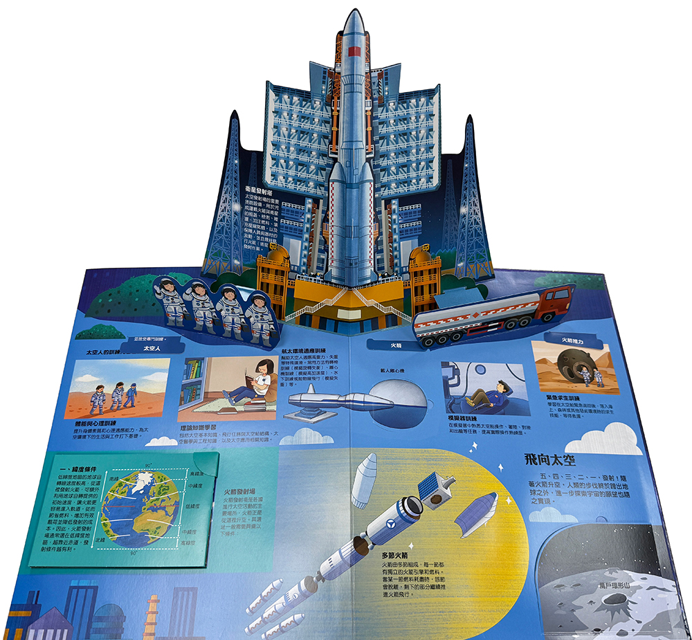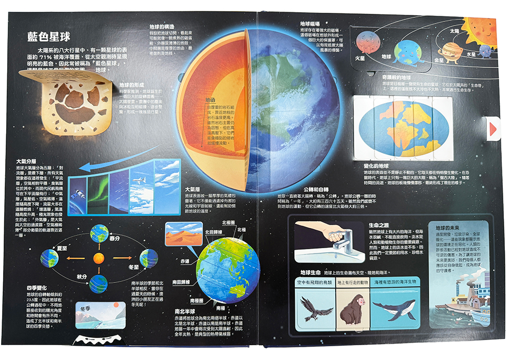 | ■商品簡介 超大3D立體震撼視覺,豐富知識的百科! 浩瀚無垠的宇宙中,藏著哪些神奇的祕密呢? 宇宙大到難以想像,也不是搭乘飛機就能前往的地方,但我們可以透過這本有趣的立體書來窺探宇宙的祕密!首先,你會看到宇宙的形成,以及包括銀河系在內的龐大星系,接著了解太陽系家族中各個星球的特徵,其中也包括我們居住的地球。人類又是如何探索外太空的呢?裡頭還有更多豐富的知識,等你一起來探索。 超大開本,內含震撼視覺的3D立體效果、超過50個互動機關、7個畫面豐富的主題場景,以精緻的插圖,呈現太空中的各種星球及飛行器樣貌。動手翻一翻,冒出超大火箭發射塔,一起了解火箭如何升空;找出書中隱藏知識,發現更多關於宇宙的祕密! 跟著書中內容,探索宇宙、銀河系與太陽系,認識我們居住的地球,以及其他星球的特點和不可思議的宇宙現象;還能跟著高科技的太空飛行器,探索宇宙的奧祕。這本大太空立體書中有孩子所好奇的各種宇宙相關知識,適合親子共讀,一起飛向浩瀚無垠的宇宙,經歷驚奇的太空之旅吧!