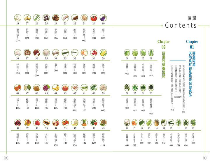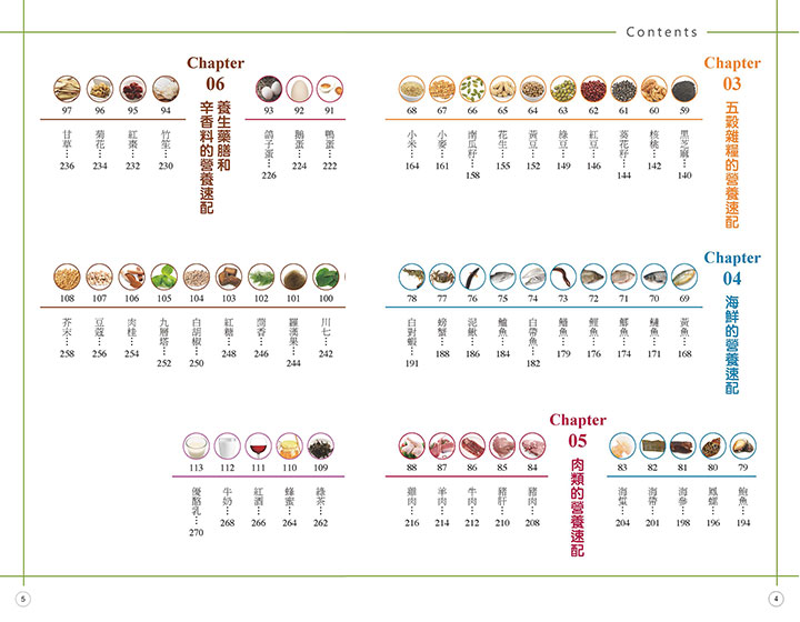 全書近2000張精美圖片,精選110種食材種類,蔬菜‧水果‧五穀雜糧‧海鮮‧肉類‧養生藥材等,帶你了解食材的樣貌、營養成分、功效,為家人的健康把關!