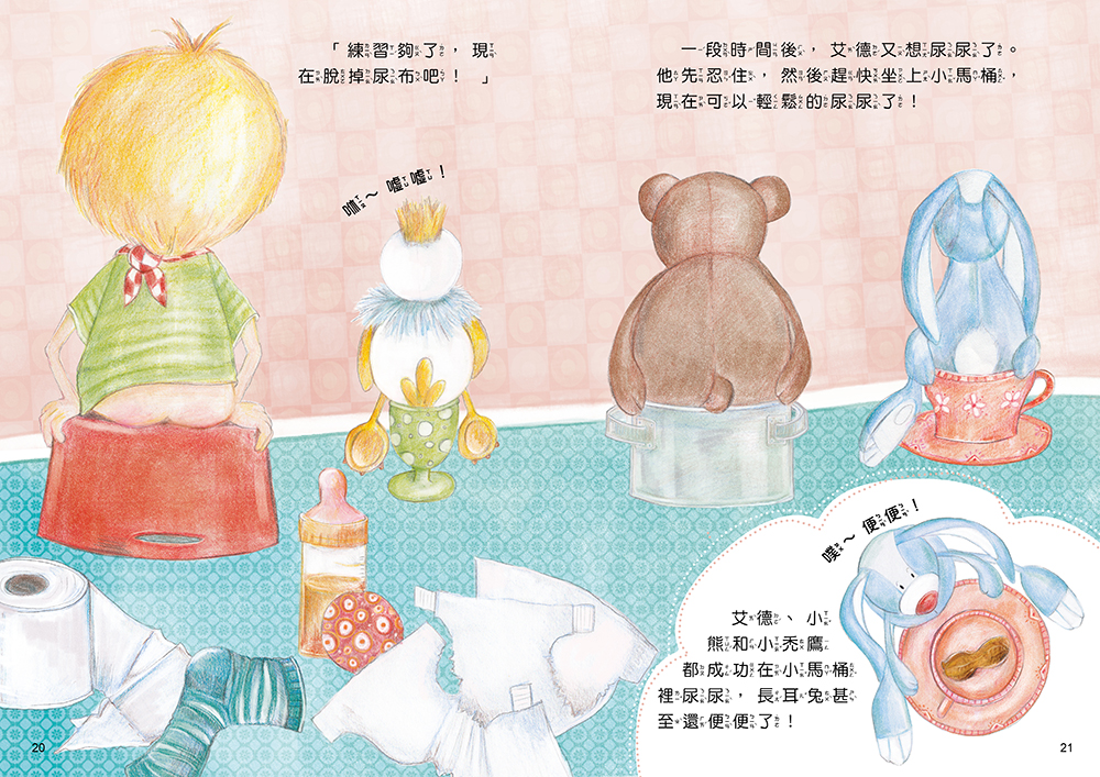 父母必須對孩子有耐心,透過觀察他的行為或動作來知道他是否準備好了,接著再給予足夠的安全感,讓孩子對於自己上廁所失敗的過程不感到挫折,願意一再的嘗試,並在成功時增加自信心,就會逐漸願意在小馬桶上廁所了。正如書中的父母,他們在艾德主動學習上廁所時給予鼓勵,在他尿溼褲子時給予安慰,艾德也在玩偶的陪伴下,用自己的方法及可愛的口訣,最終學會了自己上廁所。 現在,艾德想將他上廁所時的口訣告訴各位小朋友: 「想要噓噓和嗯嗯,快點去找小馬桶,噓噓和嗯嗯,通通掉進去!」